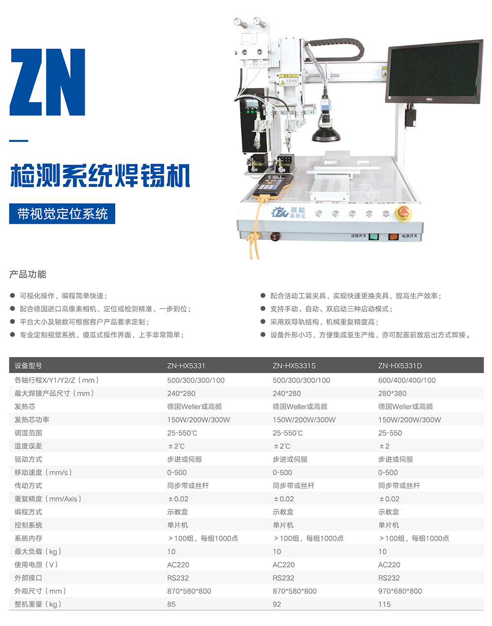 產品包括自動焊錫機(多軸桌面式焊錫機,CCD視覺白動焊錫機,機械手自動焊錫機以及非標自動焊錫機等),自動鎖螺絲機(吸附式鎖螺絲機,吹氣式鎖螺絲機,多軸自動鎖螺絲機,自動鎖螺母機等),點膠機系列設備(桌面式點膠機,CCD視覺點膠機,高速噴射點膠機,在線式點膠機等)。
